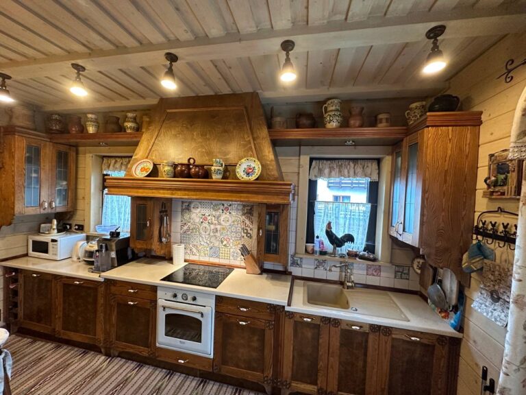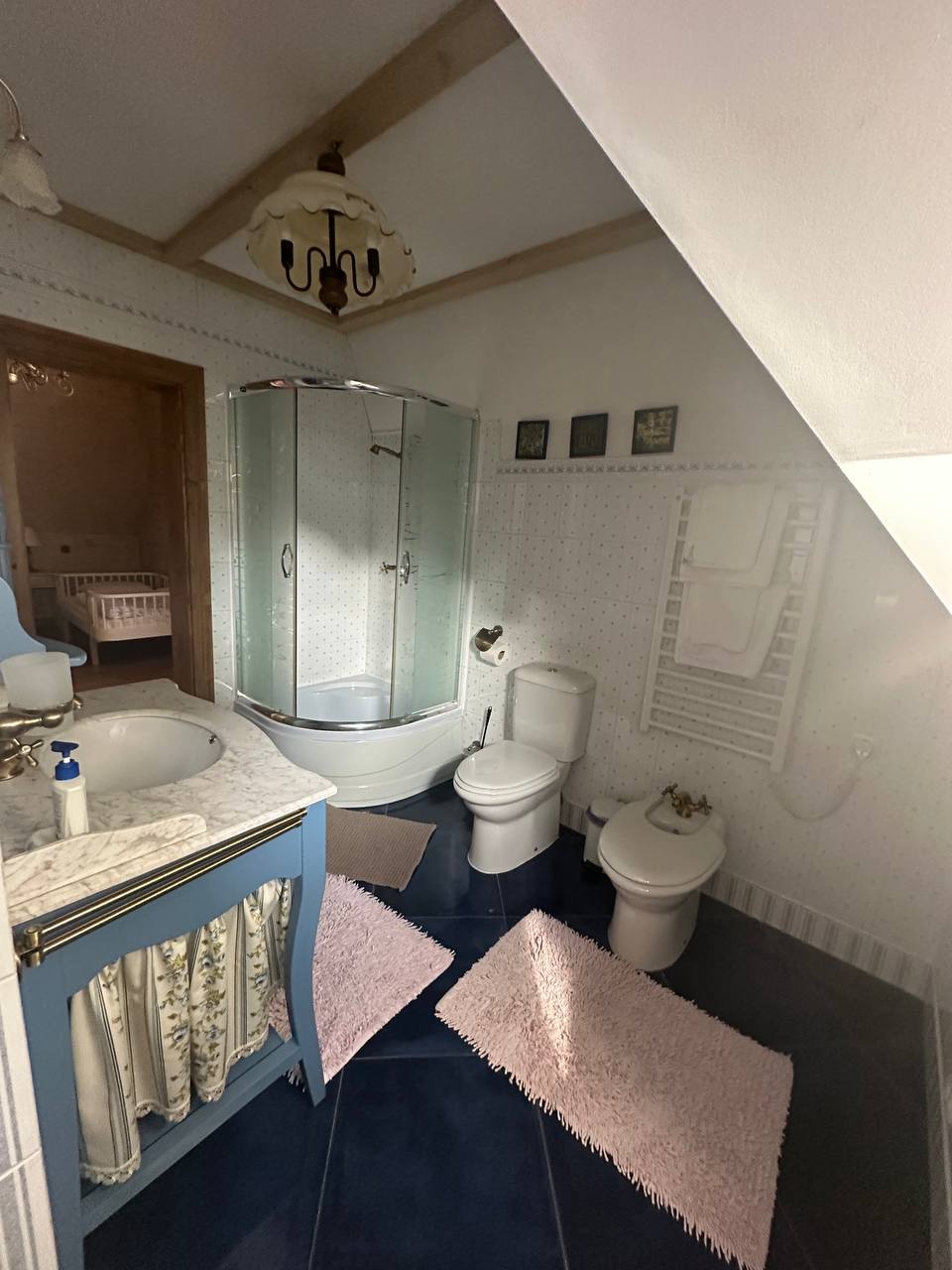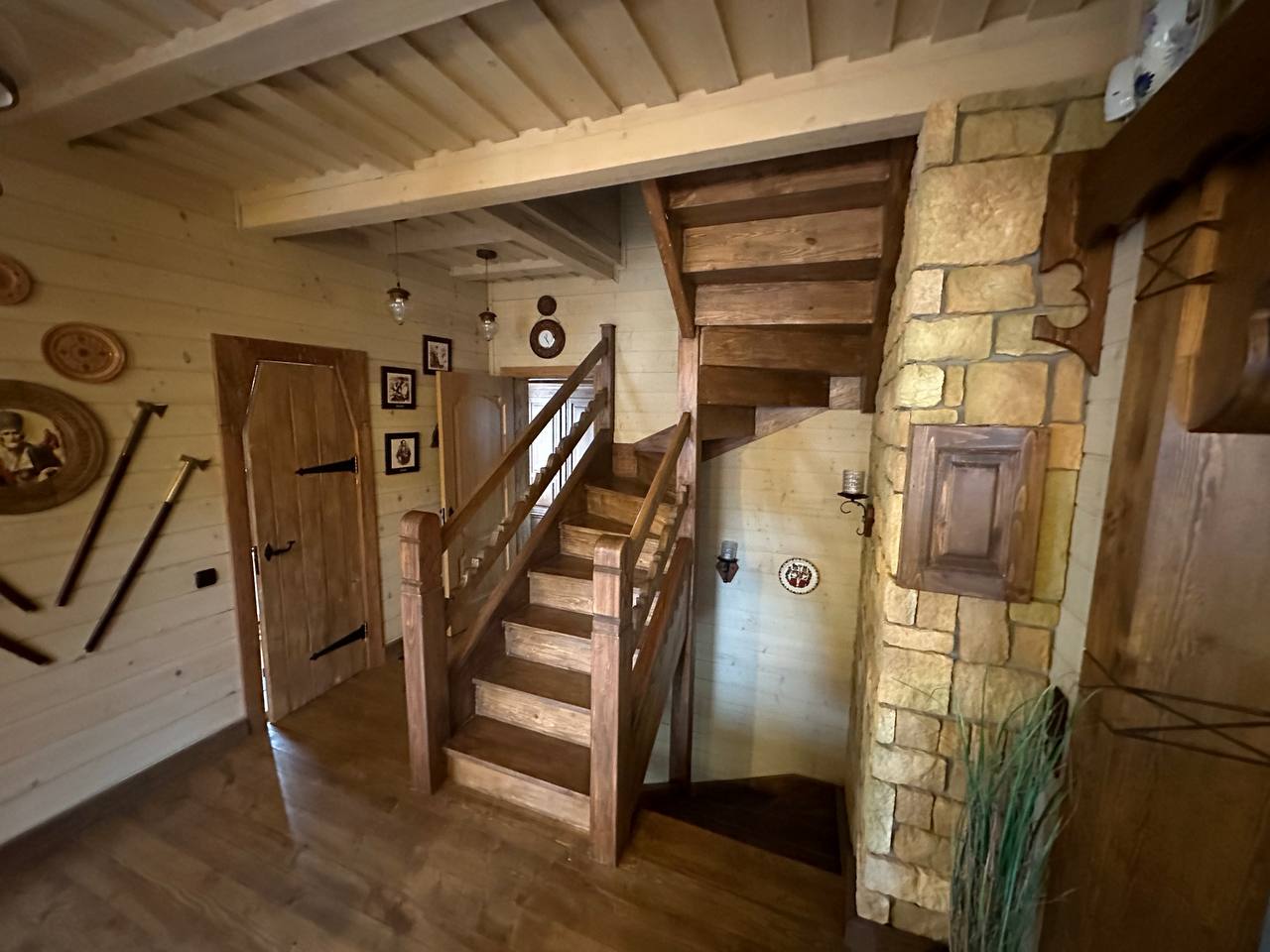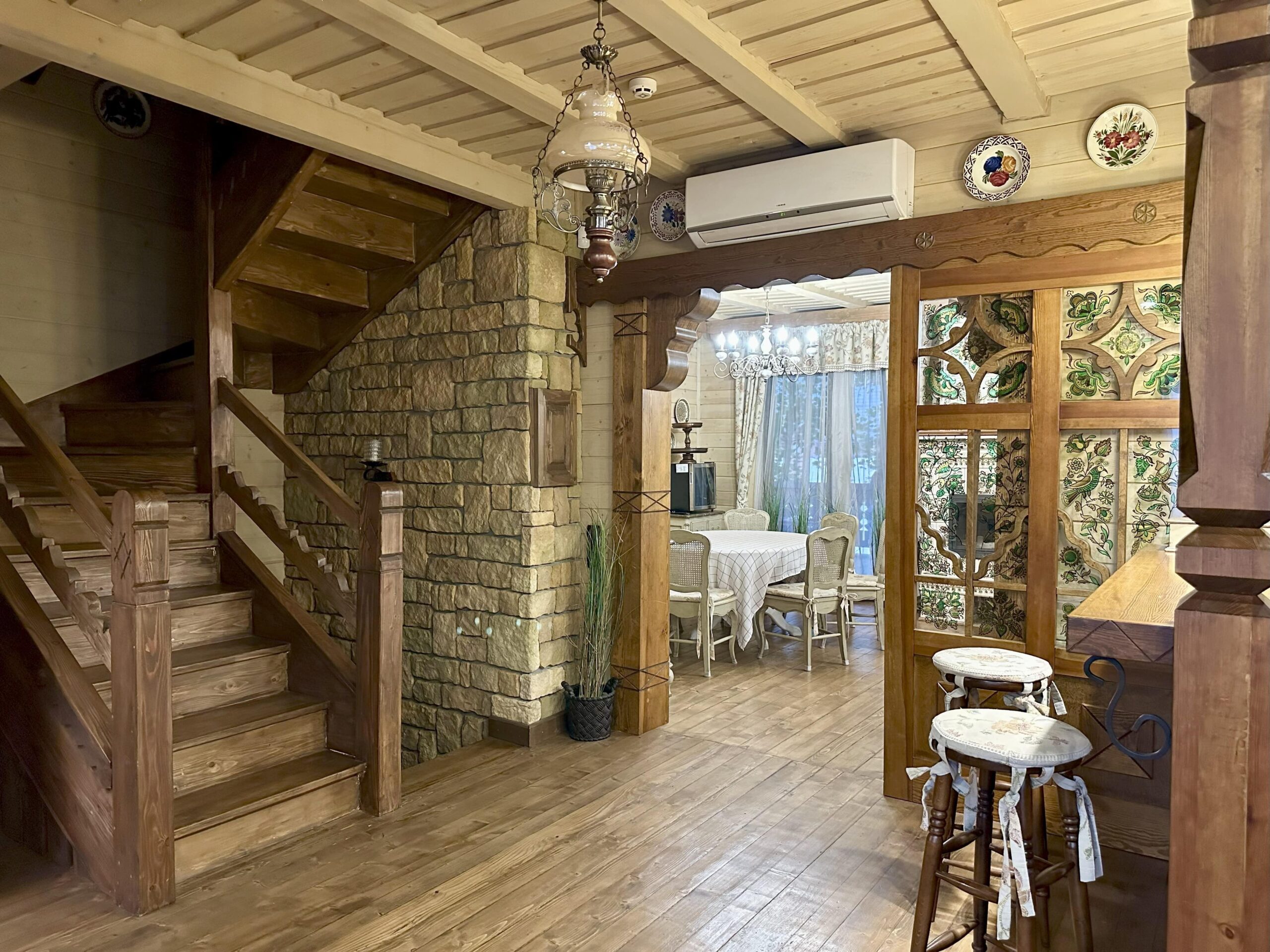 На другому поверсі — кухня-вітальня з розкладним диваном каміном та виходом на терасу .Є все необхідне : електрична плита, мікрохвильова піч, холодильник, морозильна камера , духовка , чайник, посуд, мийка, посудомийна машина, каво машина, кондиціонери санвузол (туалет, умивальник).
