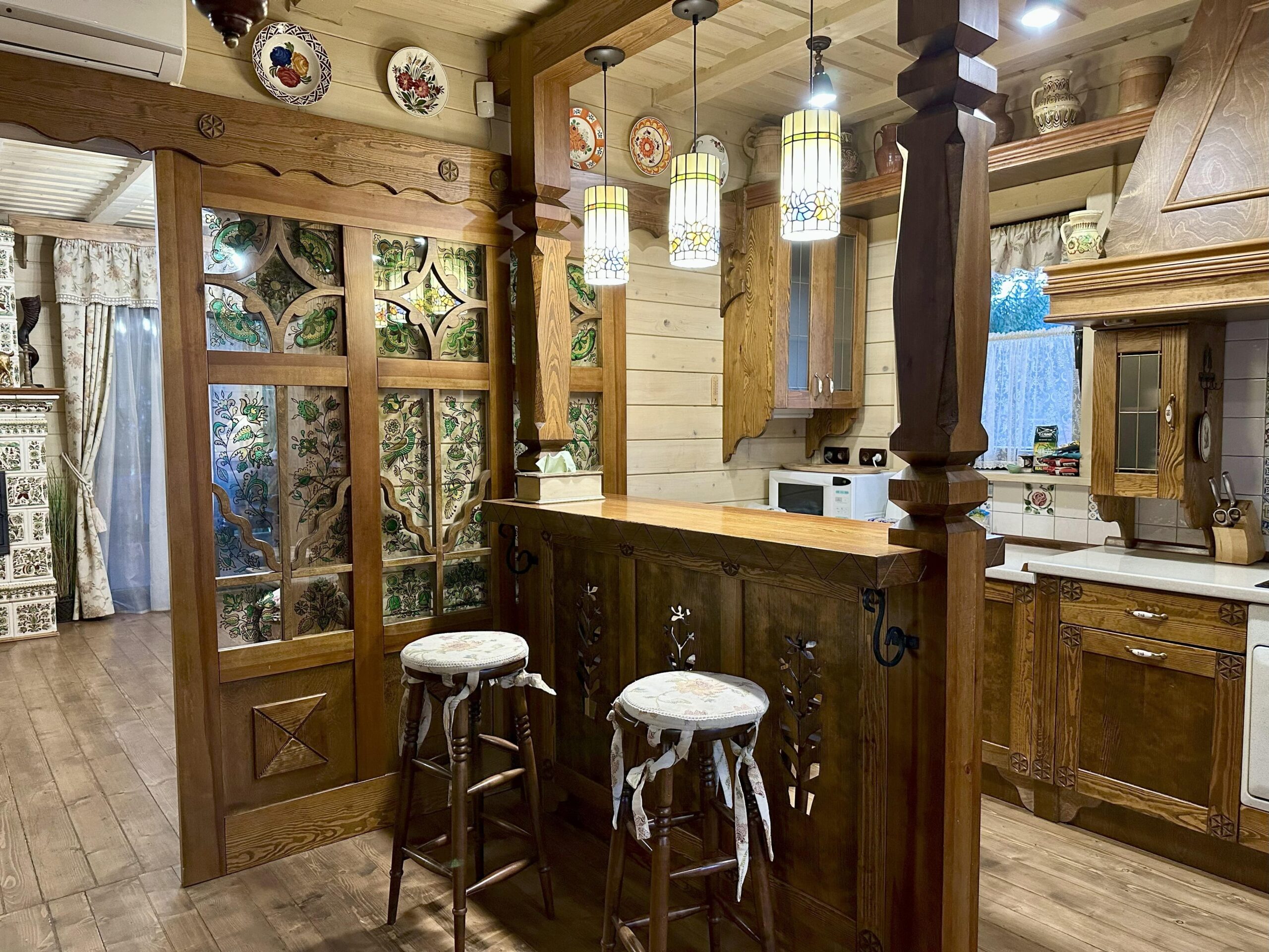 Харчування: Можна користуватись кухнею (мікрохвильова піч, чайник, холодильник, мийка, посуд). В пішій доступності ресторани, магазини, ринок. У дворі котеджу нарядна ялинка на Новорічні свята ! Безкоштовні послуги: паркінг, виклик таксі, супутникове телебачення, Wi-Fi , мангал + дрова.