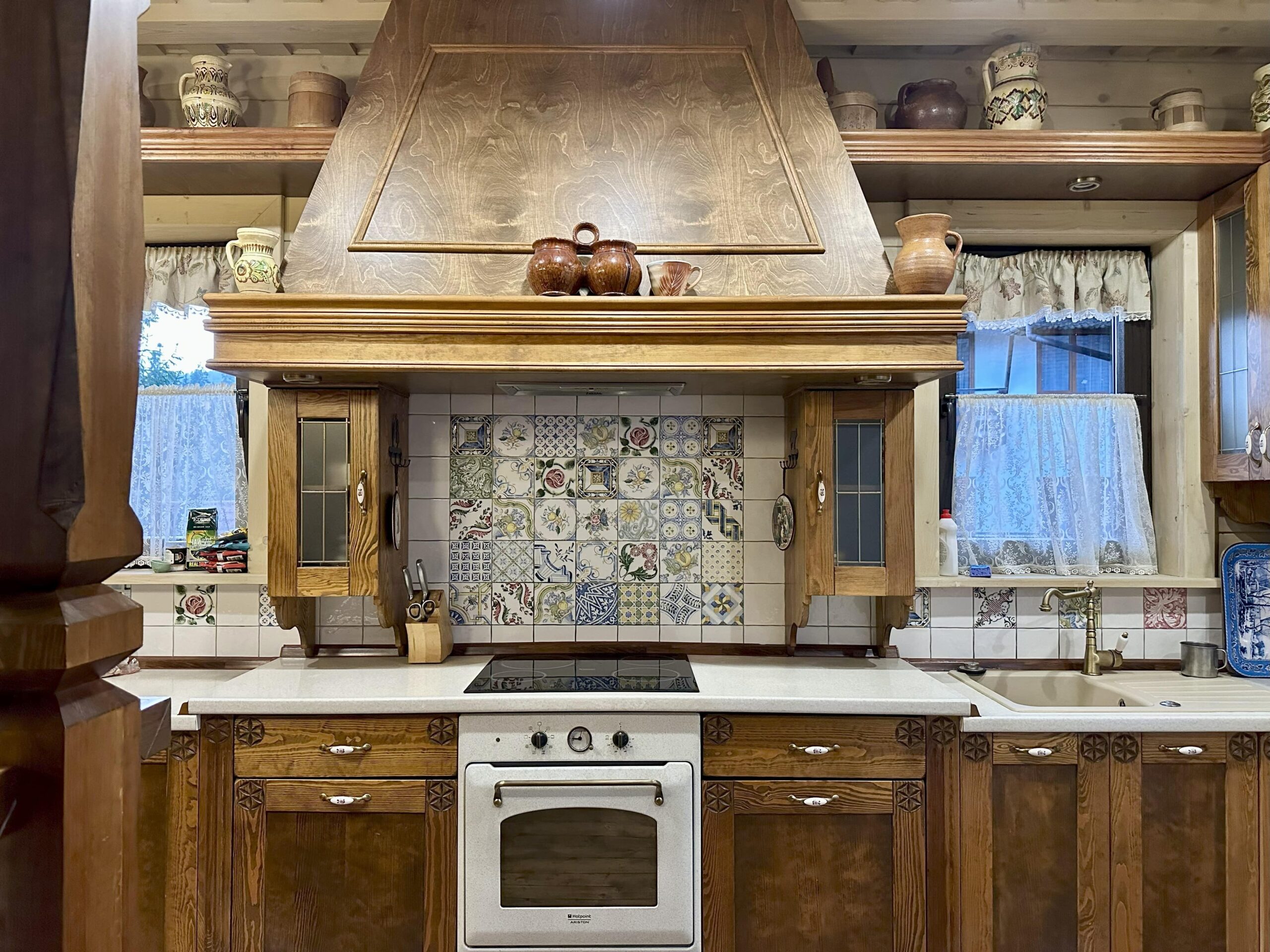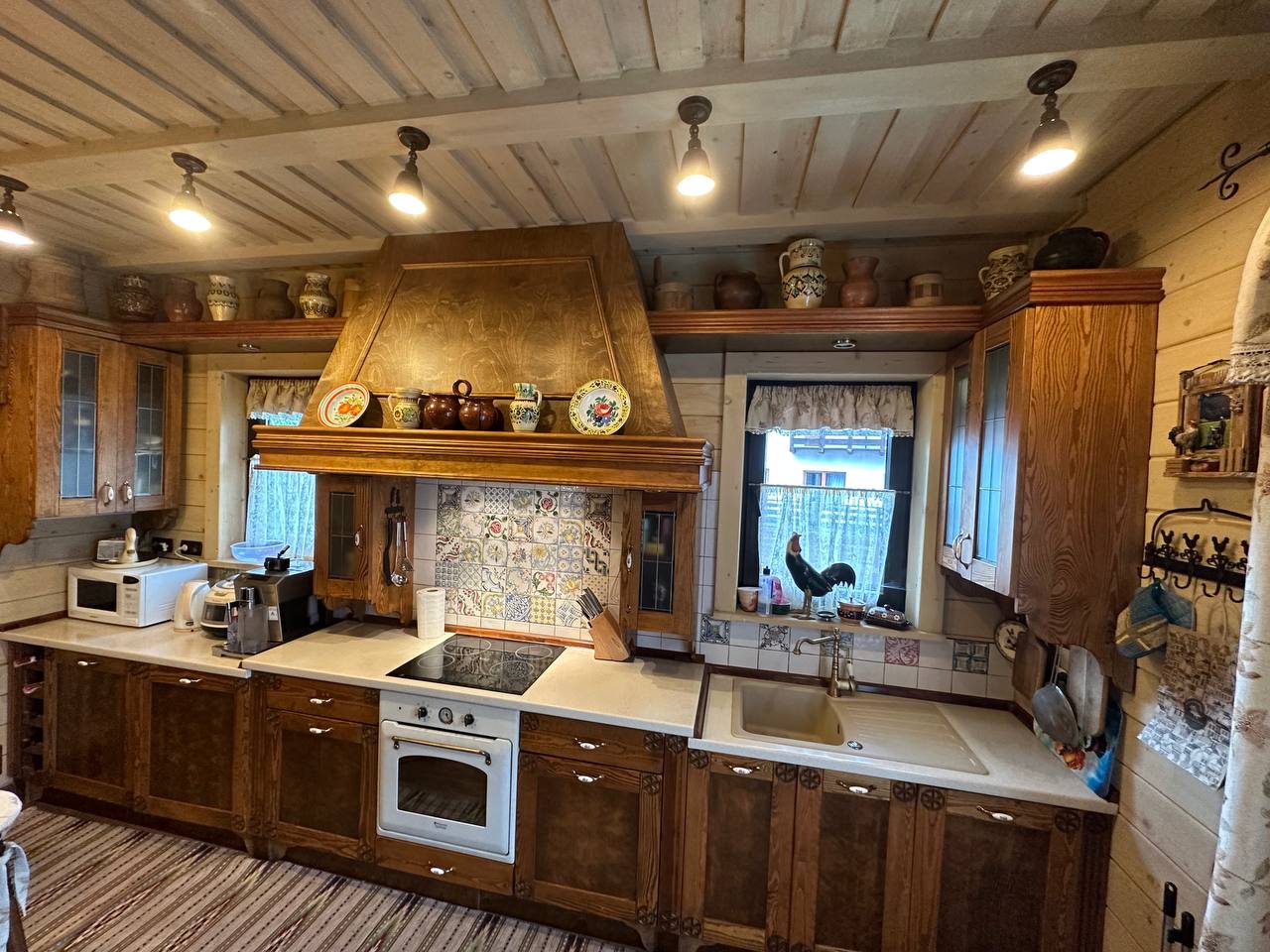У котеджі є повністю обладнана кухня: електрична плита, мікрохвильова піч, холодильник, електрочайник, посуд, мийка, посудомийна машина.