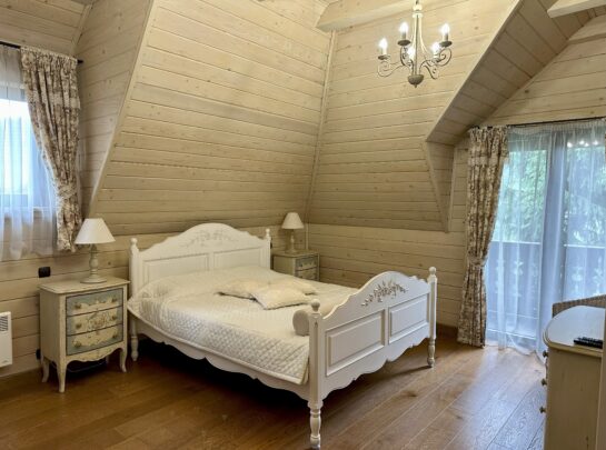 У котеджі є повністю обладнана кухня: електрична плита, мікрохвильова піч, холодильник, електрочайник, посуд, мийка, посудомийна машина.